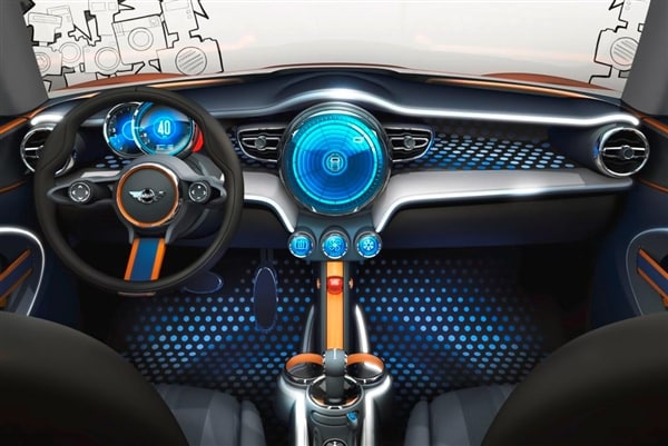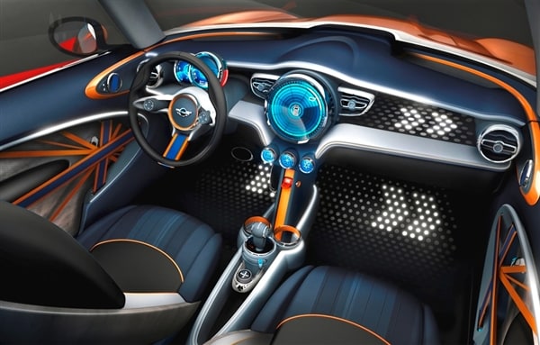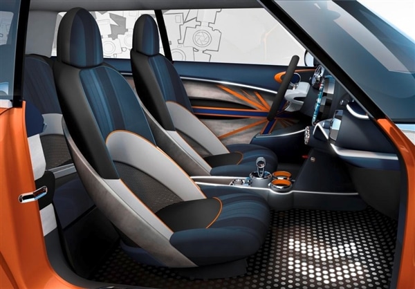 An even more dramatic transformation can be found inside the Mini Vision. While the large circular mid-dash form carries forward in its classic location, virtually everything else has been rethought to bring it into the 21st century. In addition to high-concept graphics, highlights of this more open and interactive realm include lounge-style seats wrapped in a tough, high-quality dark-blue fabric, a "floating" center console, central multifunction controller, simplified climate controls, a new Mini "click system" with removable storage components, and elastic straps in a Union Jack array on the doors that facilitate quick and easy anchoring of mobile phones or drink bottles.