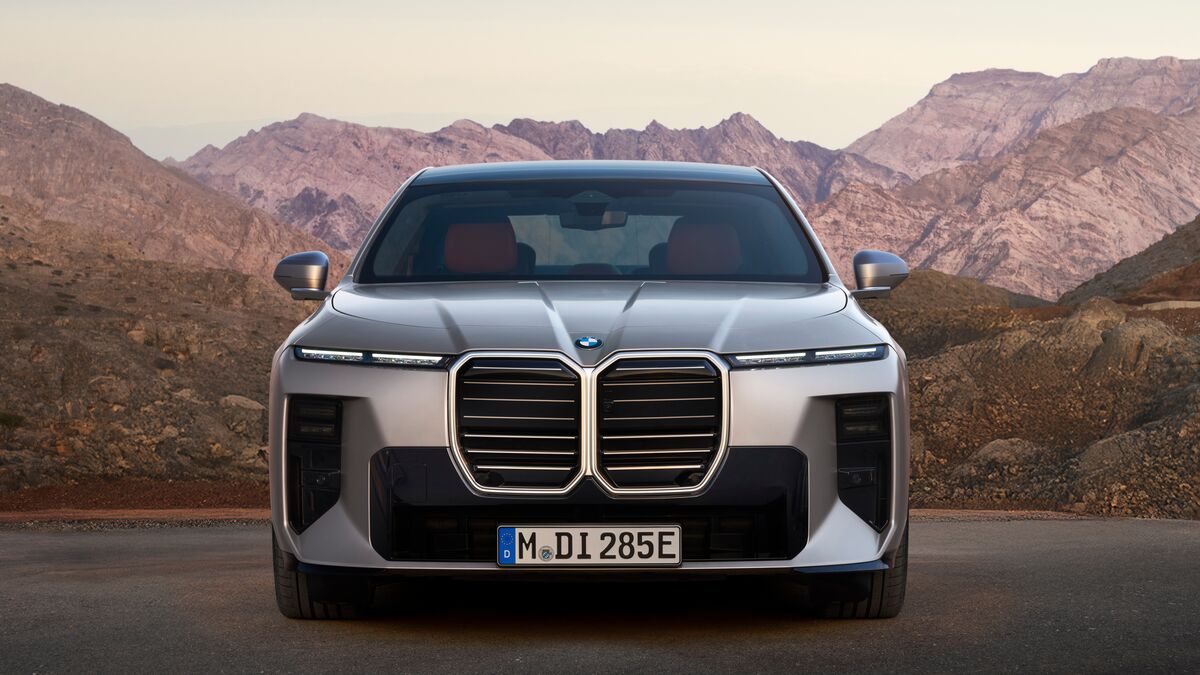 BMW leans into its garish front end design even more so for the refreshed 7 Series. Like the iX3 SUV and i3 compact sedan that debuted the brand’s Neue Klasse (“new class”) design language, the 7 Series’ classic kidney grille morphs into something like an iron butterfly, illuminated. A dual-ridged hood flows back from each of the kidneys, or butterfly wings, depending on your hot take, and thin daytime running lights try to spread the vertical face to the edges. Its face is unequivocally upright and blocky, with tall side intakes and LED headlight housings, as well as a pronounced lower grille.