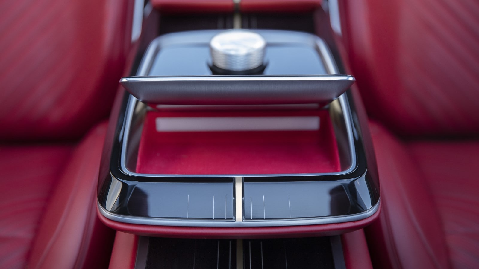 The seats are perforated red leather, inlaid with chevrons of ribbon. Decorative metal accents below the headrests call to mind the aesthetics of architecture between the world wars. They may be hell on the backs of taller drivers, however.