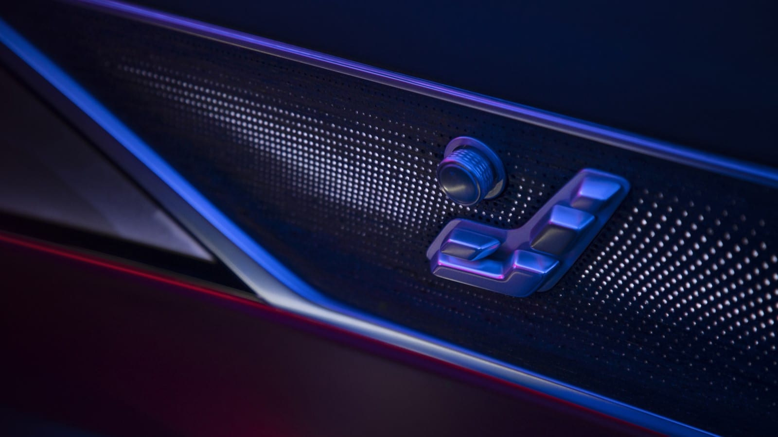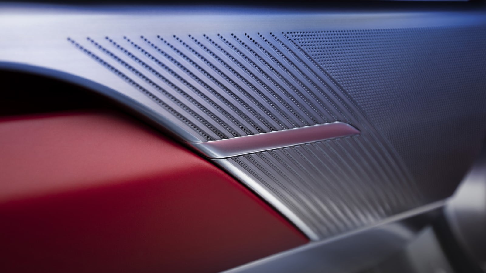 Speaker grilles inset in the doors are a similar material – it looks like brushed nickel – over red leather reminiscent of a wingback armchair smelling of tobacco.
