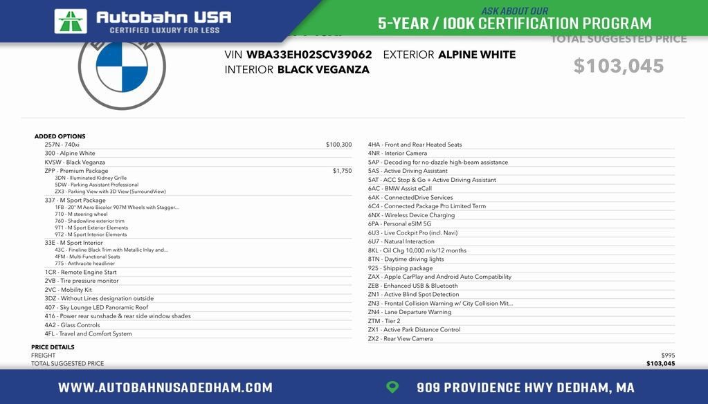 Apple CarPlay and Android Auto CompatibilityAuto tilt-away steering wheelBowers & Wilkins Surround SoundConnected Package ProConnectedDrive ServicesEmergency communication system: BMW Assist eCallEnhanced USB and BluetoothFront anti-roll barIlluminated entryLive Cockpit Pro with NavigationNatural InteractionNavigation system: BMW Maps NavigationOutside temperature displayPersonal ESIM 5GRear anti-roll barTraining Service FeeVeganza UpholsteryWheels: 20" M Aero Bicolor Style 907M