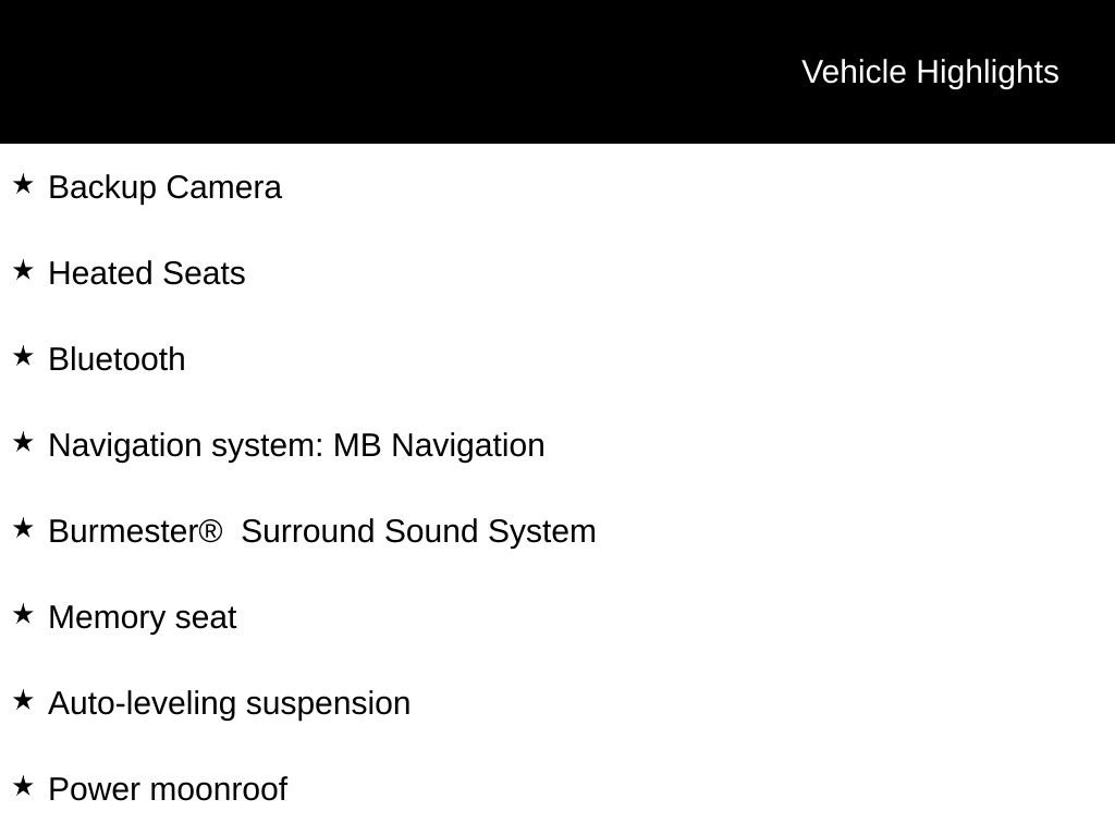 7-Seat ConfigurationApple CarPlayï¾®/Android Autoï¾®Auto tilt-away steering wheelBurmesterï¾® Surround Sound SystemFront anti-roll barIlluminated entryIncreased Towing CapacityNavigation system: MB NavigationOutside temperature displayRear anti-roll barWheels: 20" 8-Spoke