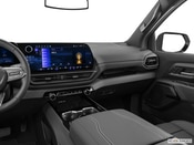 While there are interior differences based on trim, the 2025 Silverado EV is a 5-passenger crew cab with a mostly black interior. The LT has black Evotex seats with white stitchwork on the dash and seats. The RST trim has a black interior with red accents on the vents, plus red and blue stitchwork along the Evotex seats and the center console cover that serves as the armrest for the driver and front passenger. You can also get cool gray contrasting seat bolsters. The dash is dominated by a 14-inch reconfigurable digital gauge cluster and a 17.7-inch screen that controls navigation, Google built-in, trailering apps, and more. The shifter is a small toggle on the steering wheel column.