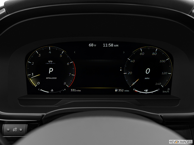 Many manufacturers today build both screens into one housing, so they look like a single, very wide screen. Infiniti keeps them separate. We prefer that approach. The one-screen looks high-tech, but this way, the steering wheel never blocks your view of anything that matters.