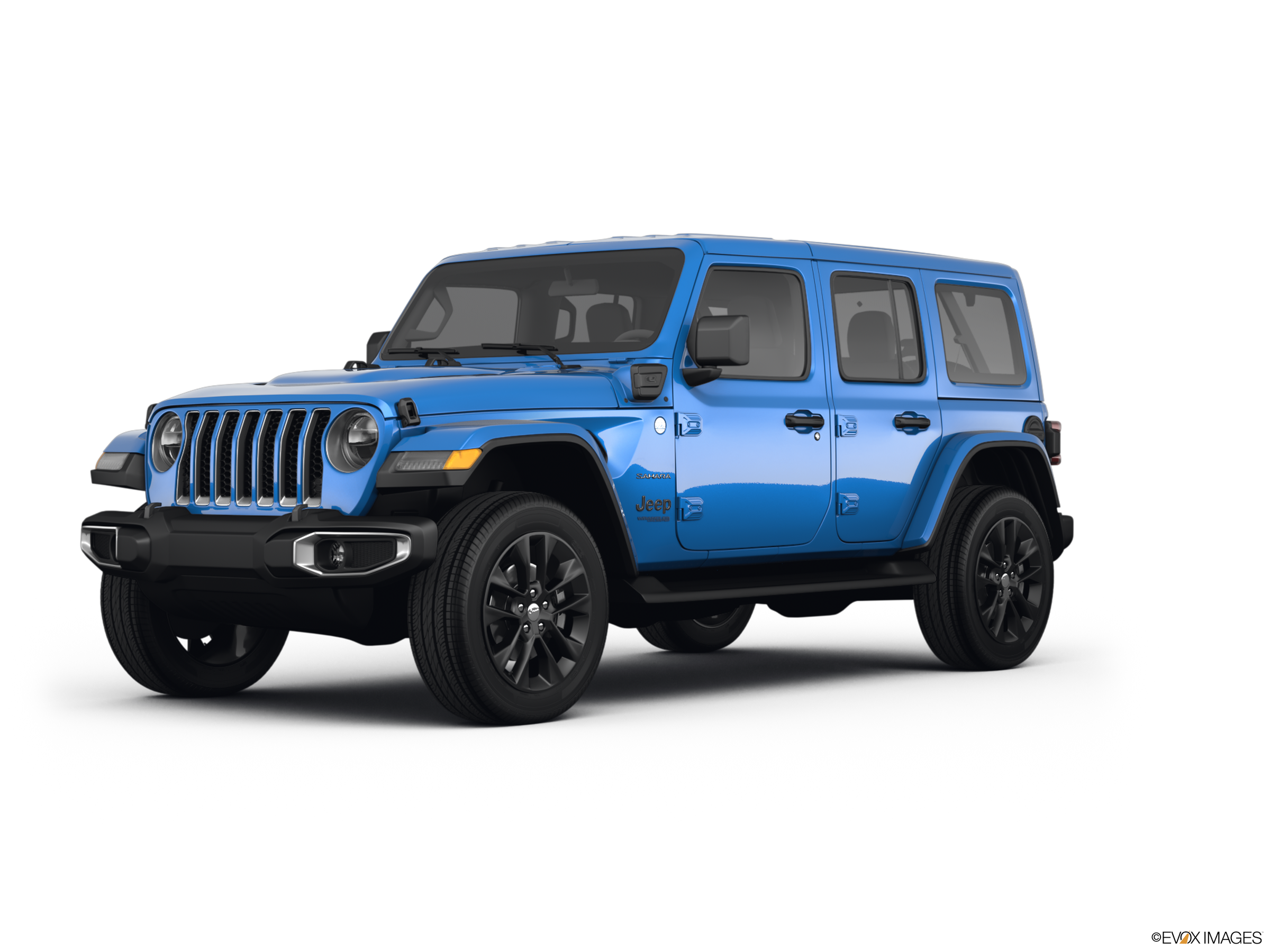 Wrangler 4xe models are distinguished by some fairly subtle blue exterior graphics. The Rubicon and High Altitude 4xe Wranglers get Electric Blue front and rear tow hooks, along with blue-highlighted badging and graphics on the hood and fenders. Depending on the trim, there are anywhere from 13 exterior color choices (Sahara) to only 4 offered on the High Altitude.