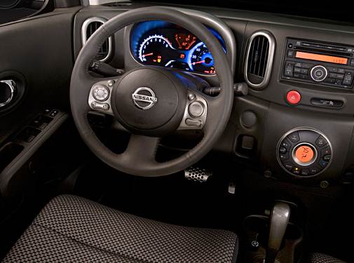Standard features found on the base 2010 Nissan Cube include a two-speaker audio system with auxiliary input, air conditioning, power locks with remote entry, a six-speed manual transmission and 15-inch steel wheels. The S trim adds a six-speaker audio system, Bluetooth, an iPod interface, steering-wheel audio controls, body color mirrors and cruise control. SL models get automatic climate control, automatic headlights and 16-inch alloy wheels. The Krom trim offers a Rockford Fosgate audio system with subwoofer, 20-color interior lighting package, Intelligent Key keyless entry and start, 4.3-inch color monitor with RearView Monitor and a body kit with rear spoiler. Standard safety features include stability and traction controls, anti-lock brakes with brake assist and six airbags.